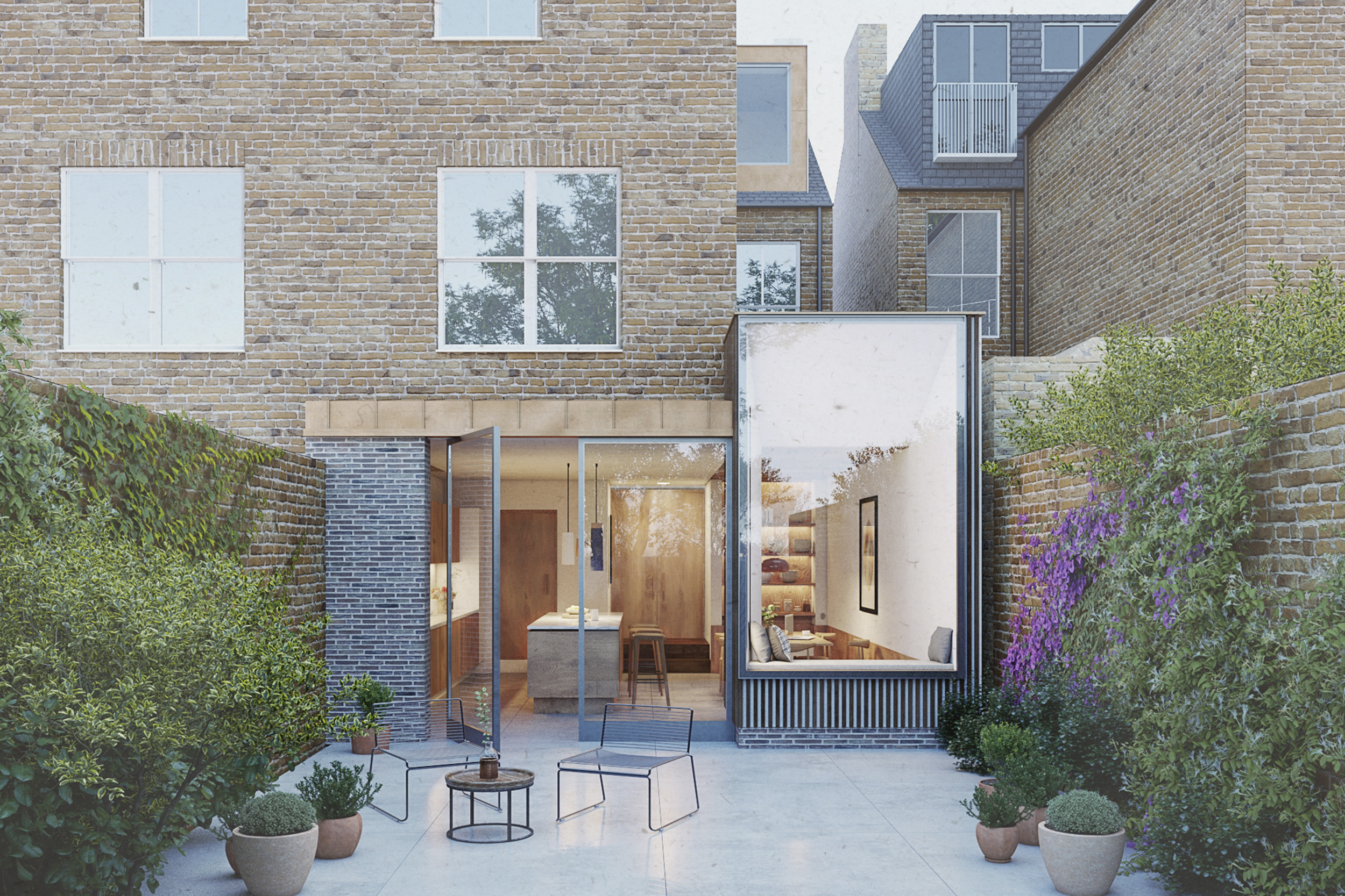 Khan Bonshek proposed a wraparound rear extension in burnt timber, engineering brick and copper. Utilising the proportions of the existing Victorian rear addition Khan Bonshek proposed a playful stepped massing, breaking up the rear facade with the inclusion of a large portal window and full height glazed pivot doors. To create vistas out to the garden, and bring light deep into plan, the portal window flares up and out, whilst an incorporated window seat provides a quiet place to sit whatever the season.