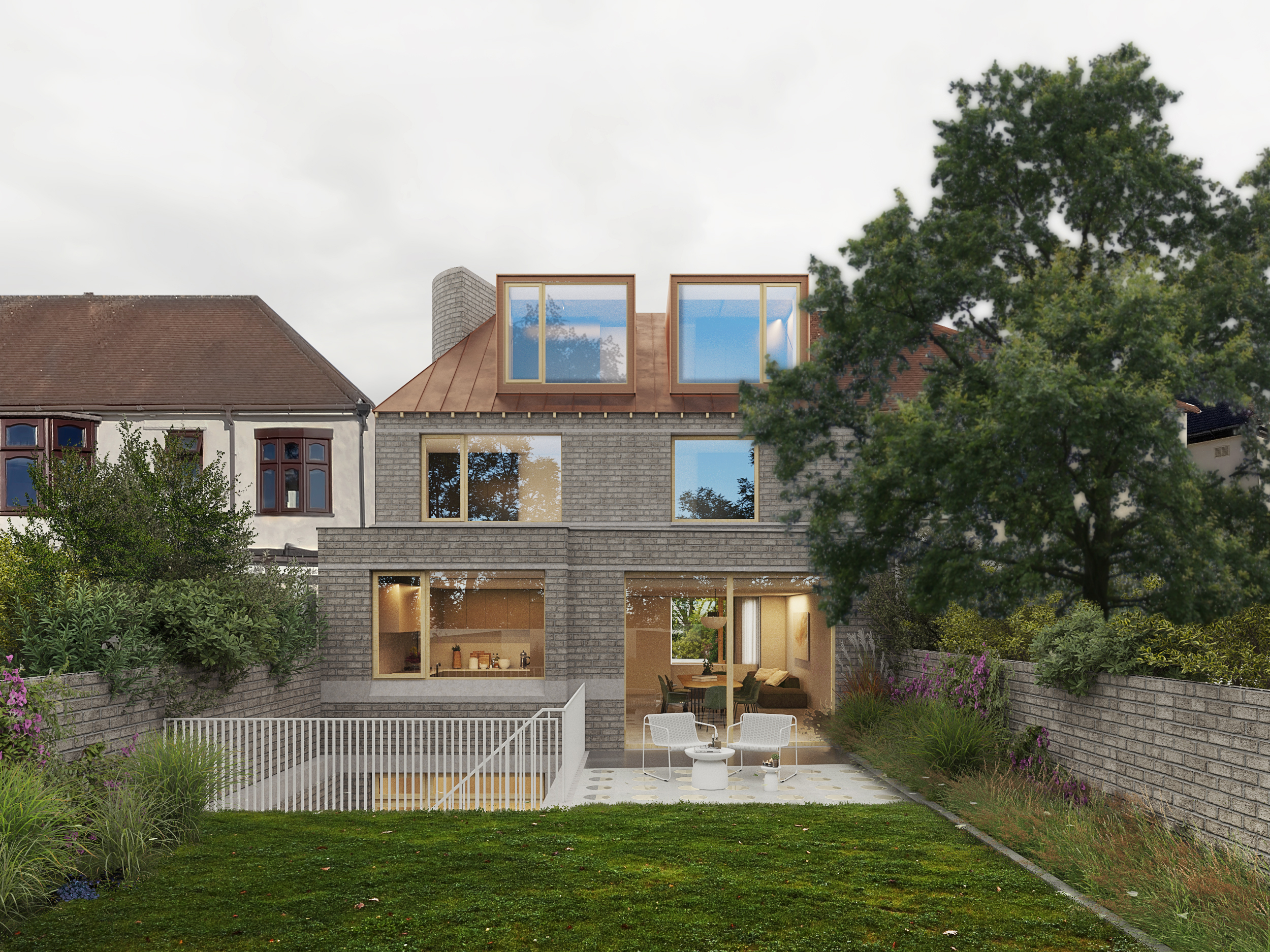 Taking cues from the interwar semidetached housing adjacent Khan Bonshek proposed a modern new build home utilising elements of Art-Deco detailing and massing. Copper standing seam roofing, hand formed grey bricks and precast concrete added a rich material palette to the home.